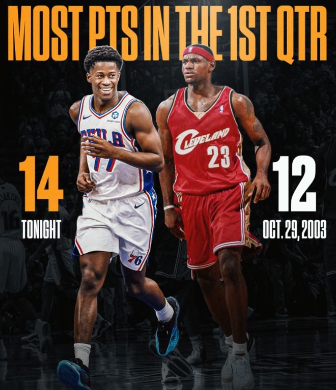 没有人能预料到,埃奇库姆的NBA首秀会如此“不讲理”。比赛开始前,外界讨论的焦点还是“缺少乔治的76人能否顶住凯尔特人攻势”“恩比德的健康状态是否影响发挥”,但第一节比赛打完,所有话题都被一个名字取代——埃奇库姆。9投5中拿下14分,这个数字直接打破了勒布朗・詹姆斯保持了22年的“NBA新秀首秀单节最高分”纪录(12分),要知道,当年詹姆斯的首秀已经被视为“天选之子”的宣言,而埃奇库姆只用一节就完成了超越,成为这一记录的历史第一人。
