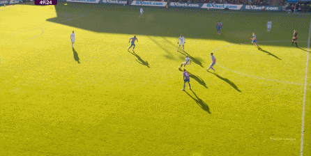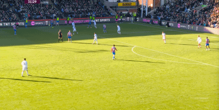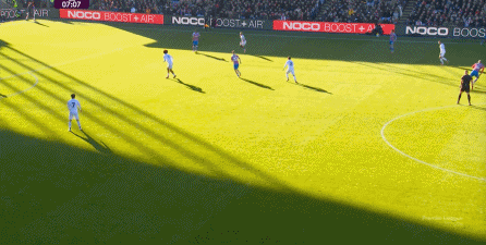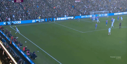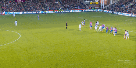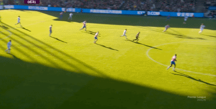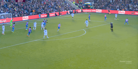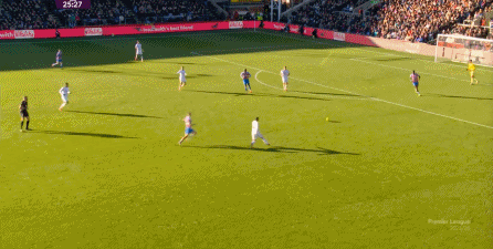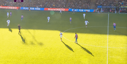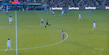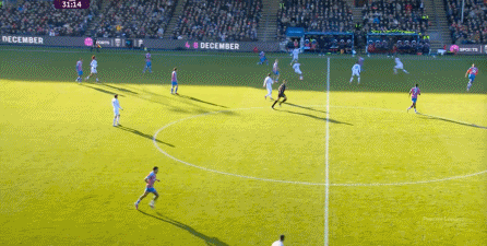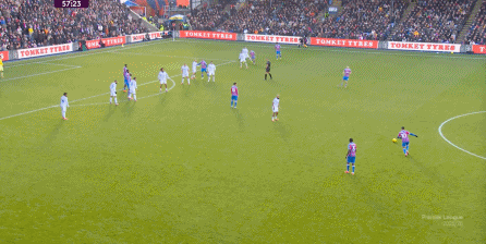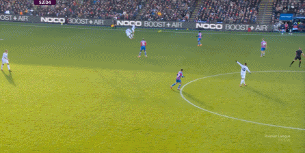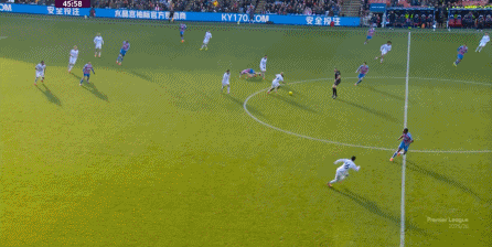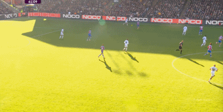 在这样截然不同的支点效果之下,两支球队的进攻自然也呈现出了完全不同的样子,比如在第12分钟,水晶宫就打出了一次非常流畅和轻松的转移进攻,带出了左侧的传中: