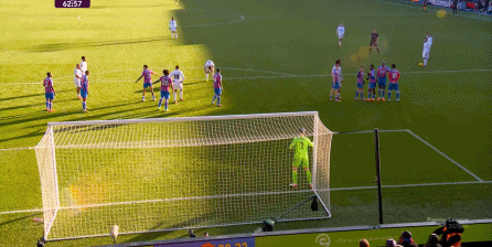 而在这次定位球主罚的过程中,曼联很好地利用了裁判哨响之后,水晶宫球员准备不及的瑕疵,尤其是在球门后的这一视角,可以清晰地看到门将亨德森刚刚布置好人墙回位,便立刻开始扑救的过程: